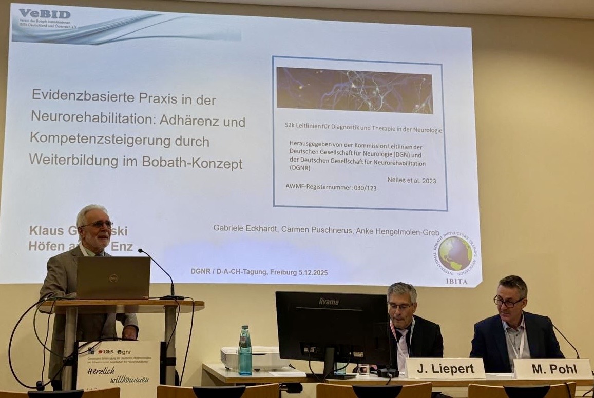 Vom 4. bis 6. Dezember 2025 fand die diesjährige Fachtagung der DGNR gemeinsam mit den Österreichischen und Schweizer Fachgesellschaften der neurologischen Rehabilitation (D-A-CH) in Freiburg statt. Klaus Gusowski präsentierte in Vertretungen von Frau Dr. Eckert die VeBID-Studie „Evidenzbasierte Praxis in der Neurorehabilitation: Adhärenz und Kompetenzsteigerung durch Weiterbildung im Bobath-Konzept“ in einem Kurzvortrag. Das Mixed Method Design erlaubt quantitative und qualitative Aussagen über Adhärenz und Art der Umsetzung der Empfehlungen der S2k-Leitlinie „Rehabilitation von sensomotorischen Störungen“ durch den Besuch von Bobath-Kursen. In dem Vortrag wurden die quantitativen Ergebnisse zum Thema der Leitlinienempfehlungen für den Schlaganfall beleuchtet, die sich als überaus positiv darstellten. In der sich anschließenden Diskussion wurde ein großes Interesse sowohl an der Studie selbst als auch an den qualitativen Ergebnissen erkennbar. Das trifft sich mit der Absicht der Autor*innen, diese Studie in Kürze zu publizieren.